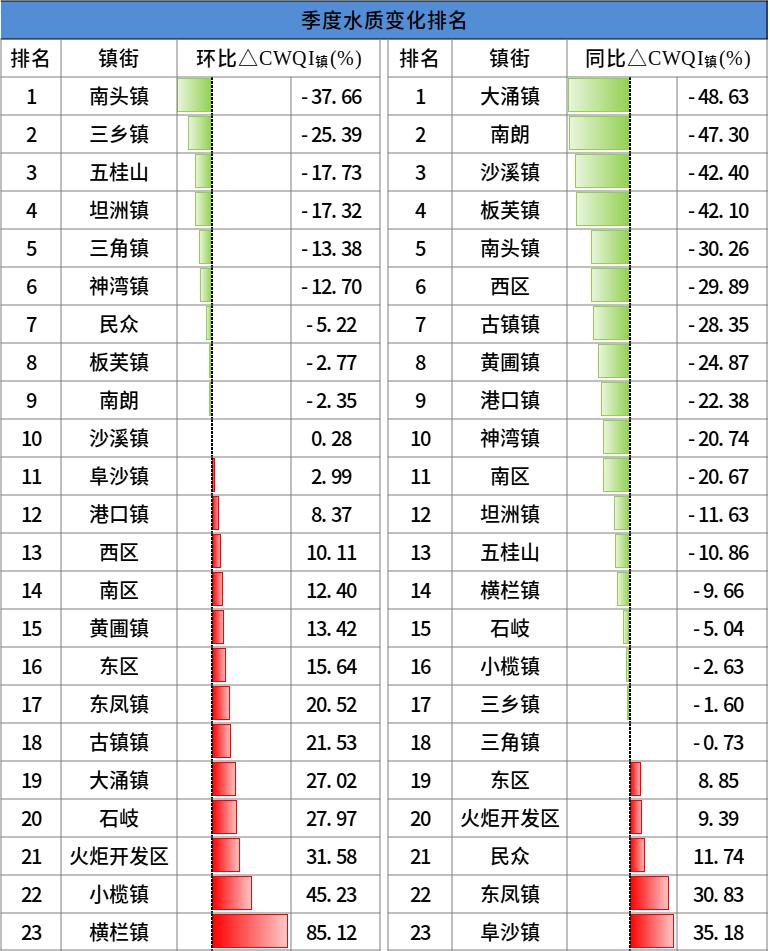 注:环比∆CWQI镇为与上一季度比较,同比∆CWQI镇为与上年同一季度比较。∆CWQI镇为负值,说明镇街地表水环境质量变好;∆CWQI镇为正值,说明镇街地表水环境质量变差。